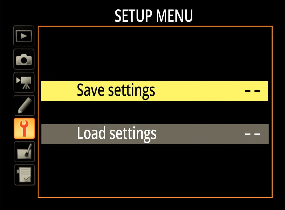 With most Nikon DSLRs, the option is found under the Setup menu. Simply select the option and then choose to either Save or Load your settings.