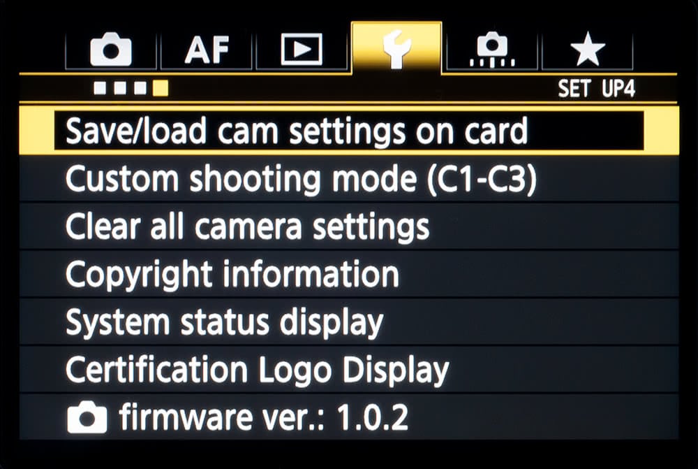 With most Canon DSLRs, the option is also found under the Setup menu. Simply select the option and then choose to either Save or Load your settings.