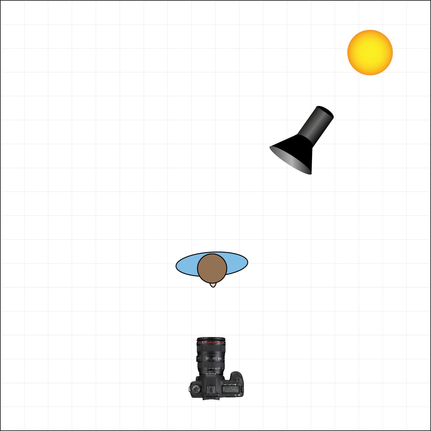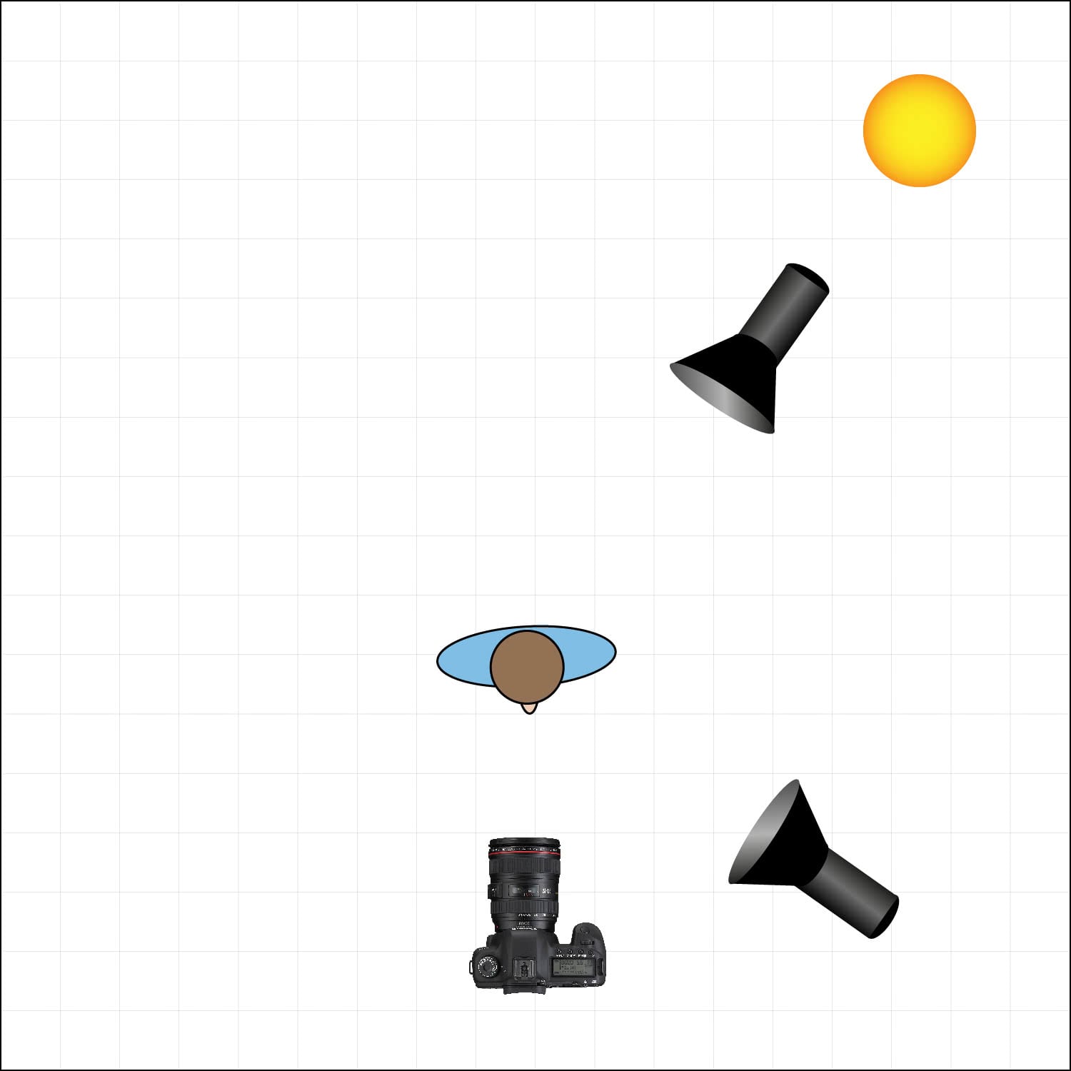 Unless we are shooting at night it is generally the sun. This means the main source of light (or key light) will almost always be the sun, even if it is diffused behind a cloud. This shapes the entire scene and the only reason to use additional lights is to enhance power and fill in the gaps where light from the sun is missing. Once the direction is decided, I will determine if the light from the sun is bright enough. Living in England the answer is usually no. If this is the case, we will place our key light so the light falls in the same direction as the sunlight. Below is a diagram of how this might look.